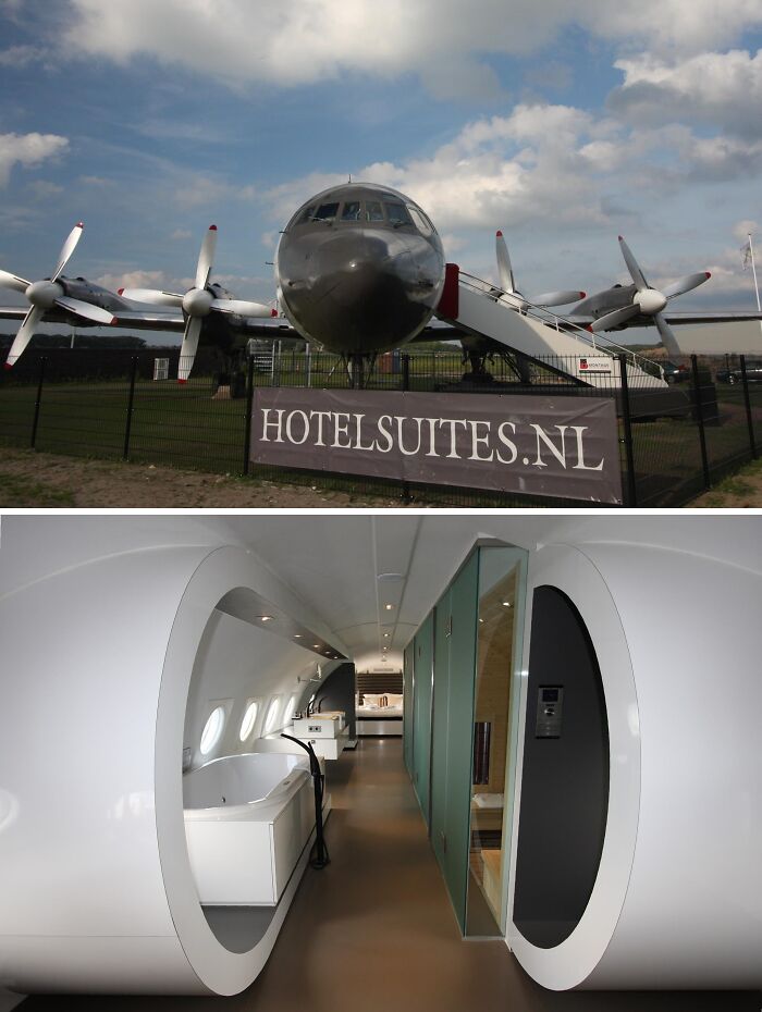 An old decrepit Iljoesjin Il-18, converted into a beautiful hotel suite next to a small airfield. With a beautiful old city to the east (Deventer) about 15 minutes away, and an incredible nature reserve (Veluwe) on the other side of the -not *that* interesting- city in the west (Apeldoorn. Only 2 things worth visiting:the former Royal palace 't Loo [pronounced as "low"] and the zoo Apenheul, specialized in monkeys) But there are plenty of normal, affordable hotels in the area, as well as several great vacation parks ( Landal, Centre Parks, Roompot)