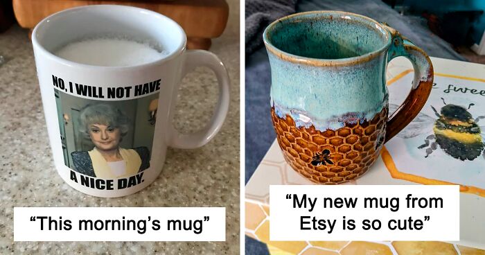 These days, we have the technology to limit heat or cold, but most people still feel comfortable with the classic, flat-based, handled mug. Why fix what isn’t broken? These tend to have flat walls, that make it easy to display images and texts with a bit of personal flair. And if you want to see other interesting mugs, look no further, Bored Panda has got you covered, you can find our other collections here, here, and here.