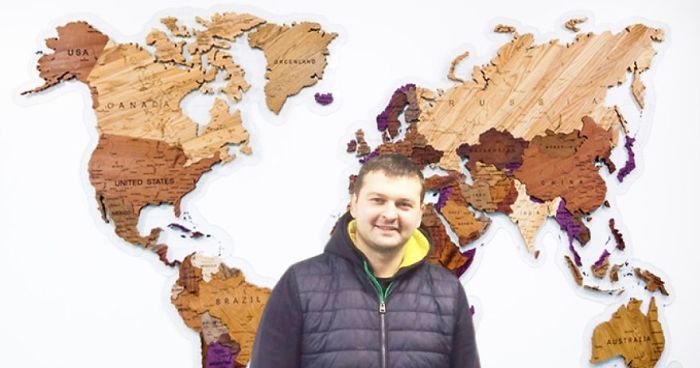 Hi! I’m Dmytro Tantsuyev. I’m a 28 years old Ukrainian American entrepreneur and artist. I love to travel, woodworking and maps! I’ve lived in 7 different cities in 3 countries and I’m interested in the ways to combine the things I love with creativity and business. I was born in a small rural town in Western Ukraine and studied engineering in Moscow. I moved to the US 9 years ago and I’ve taken different jobs in different places just to explore the country. Last year I and Farhad Tokhtamov, a university classmate, fellow artist and custom furniture maker from Moscow, decided to launch Wood Map, a small luxury souvenir production business that ships anywhere in the world.