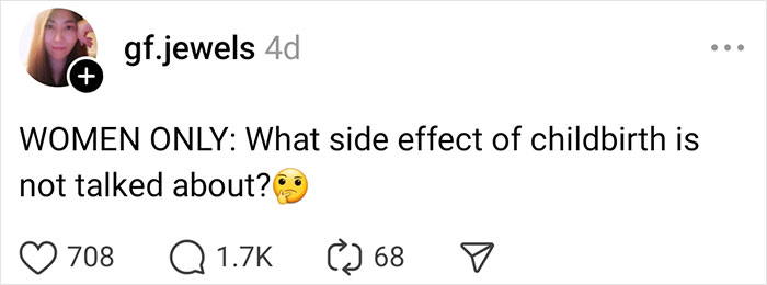 Unsurprisingly, some of the side effects of childbirth are not publicly discussed that often either. But one netizen recently decided to shed some light onto the topic and addressed the female internet users on Threads, asking them about the lesser-known side effects of bringing a child into this world.