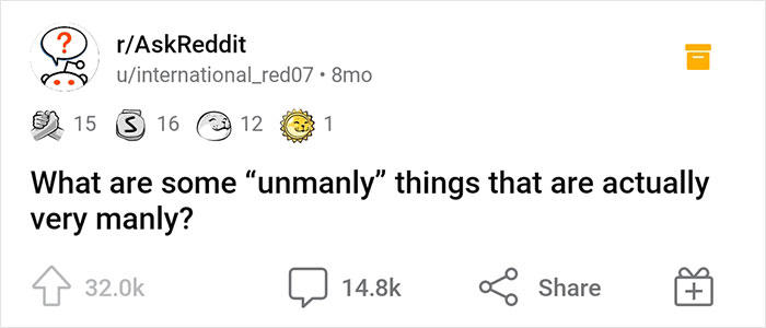 Unfortunately, some people still divide up some activities and behaviors according to gender, based on some pretty ambiguous assumptions. This idea sparked a discussion online after redditor u/international_red07 asked everyone to share some “unmanly” things that are actually the opposite. Scroll down to read what people had to say about this.