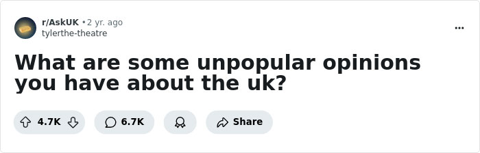 The selection of opinions that we suggest you read today is based on this online thread, the author of which, the user u/tylerthe-theatre, once asked netizens in the AskReddit community: "What are some unpopular opinions you have about the UK?" Yes, the British generally have a very high opinion of their homeland, and very often these opinions have a solid basis, but there are critics too.