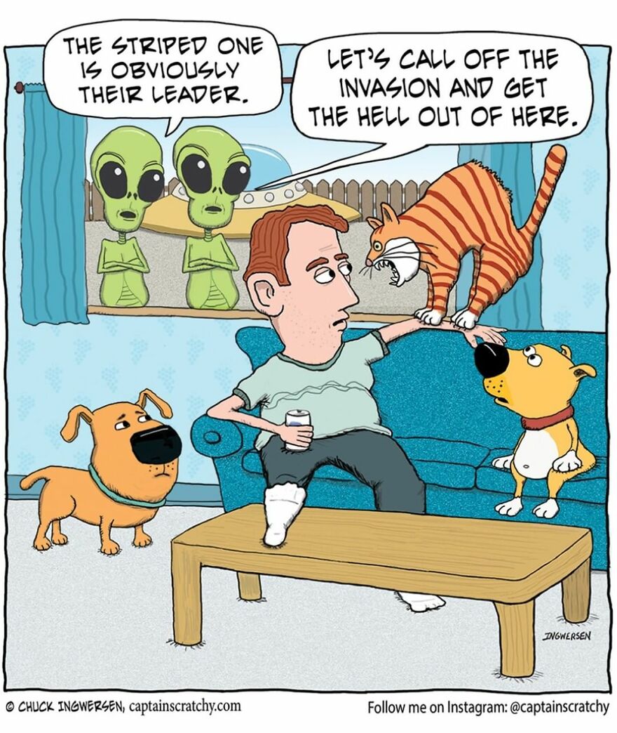 Chuck Ingwersen is an artist who creates comics, cartoons, and artwork "on a wide range of fun swag". These comics cover a lot of funny and silly situations, from a cat at a job interview, contemplating chickens, to sharks looking for something to eat. On Instagram, Chuck is known as Captainscratchy and has more than 4,000 followers. The webcomic features dogs, cats, bears, horses, beavers, sharks and other animals. All the comics are fun, easy to read, and will probably make you grin. We hope that they will brighten your day!