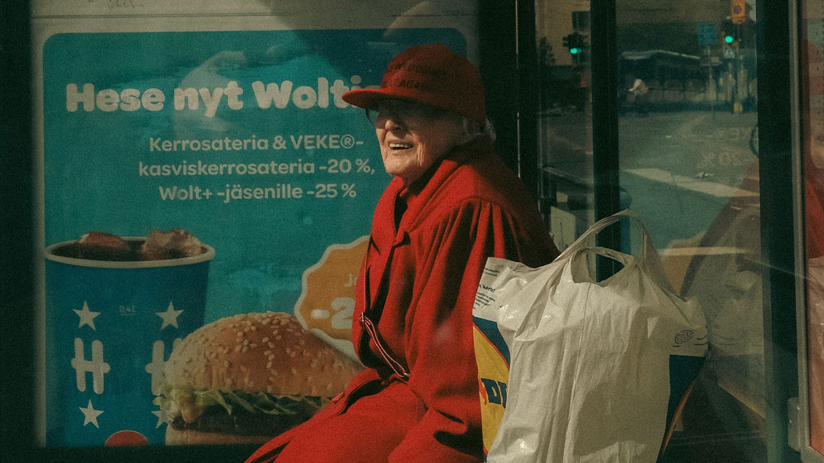 Elderly woman in red coat and hat sitting at a bus stop in Helsinki, urban photos capturing real street moments.