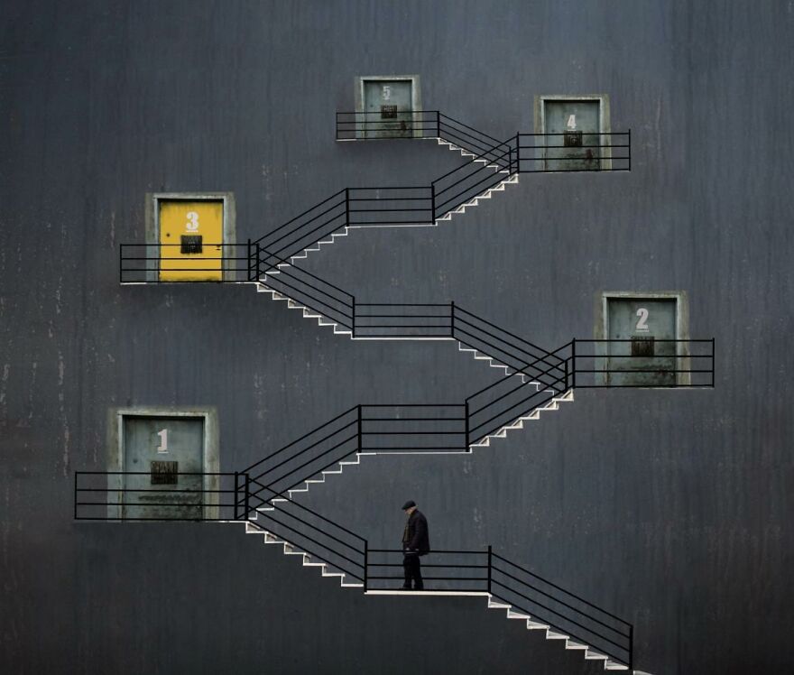 Minimalism, surrealism, and street photography all wrapped up into one seemingly simple image at first glance. However, the changing size of the doors, as well as the central positioning of the subject and the pop of yellow, ensures the image doesn’t become flattened. Creativity doesn’t always have to be loud