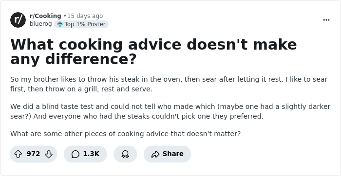 Someone asked “What cooking advice doesn't make any difference?” and people detailed their tips, tricks and observations. We also got in touch with the person who posted the question in the first place. So get comfortable as you scroll through, upvote your favorites and be sure to share your thoughts and experiences in the comments below.