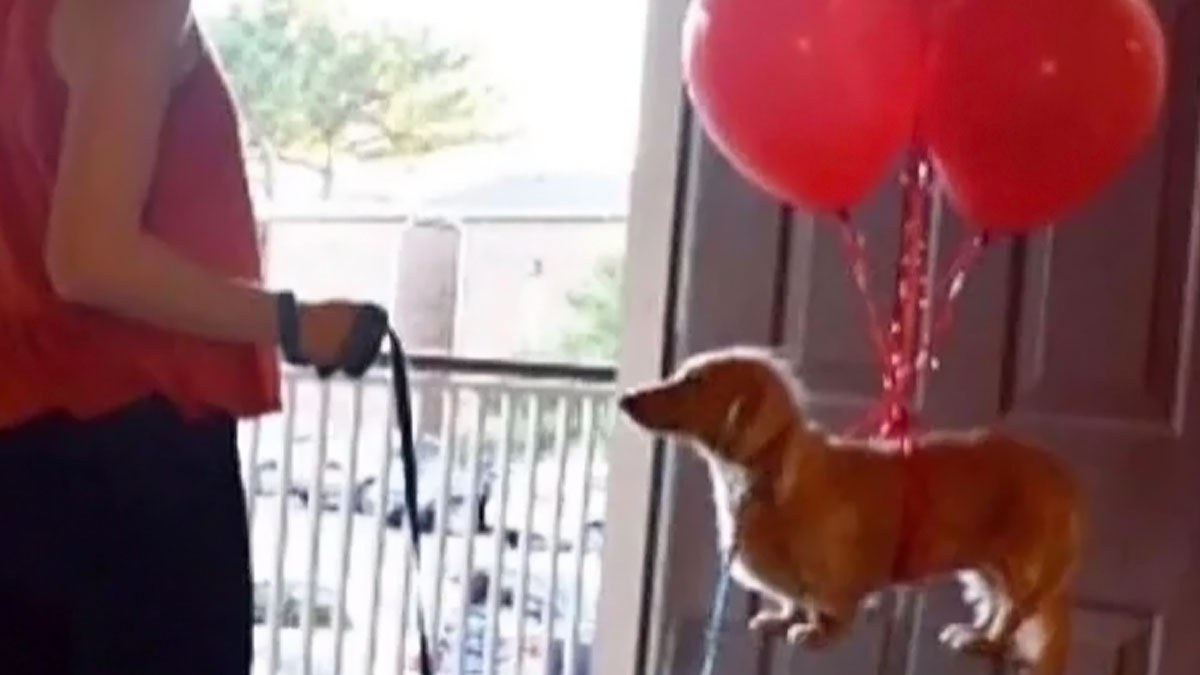 They did it on MythBusters, with 3500 balloons and a 44lbs child. If this is a 20lbs Dachshund, it would took 3500 / (44 /20) = 1590 balloons.