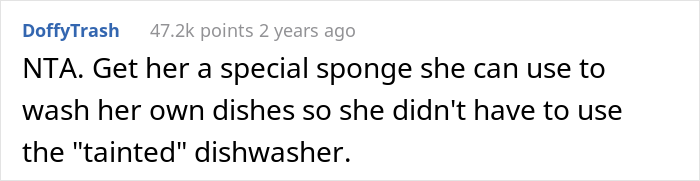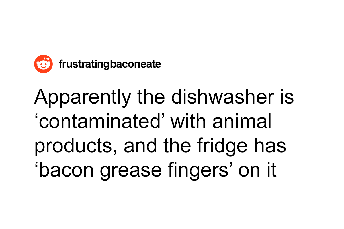 Load More Replies...I loved the suggestion to get the daughter a dedicated meat-free dishwashing sponge! The dad here is doing a great job of supporting his daughter's developing autonomy; since she is too young to work, it makes sense for the parents to buy her food and cooking things. However, now that they've been so accommodating, it sounds like the next thing she needs is a reminder that, as the saying goes, her right to swing her arm ends at the next person's nose. She's years away from getting to make the rules for her own "castle." If she's planning on college, the dining halls will probably have vegan options--almost all of them do, these days!--but there won't be a separate kitchen or equipment. And it's entirely likely that her assigned roommate will sometimes eat meat in the room--some schools have a "Veggie dorm," but it's certainly not universal, and even where it exists, freshmen are generally not guaranteed their housing preference.