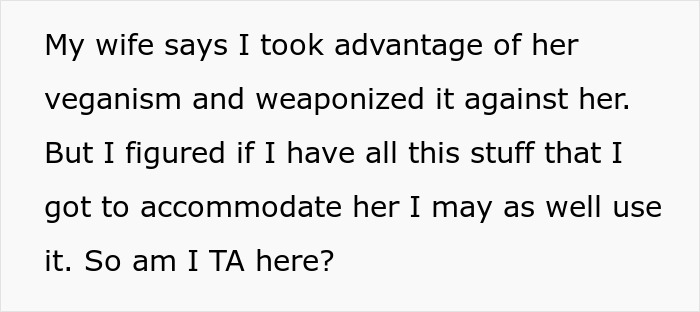 Due to extra space, the husband started buying in bulk and consuming more meat, which led to his wife accusing him of using her veganism against her