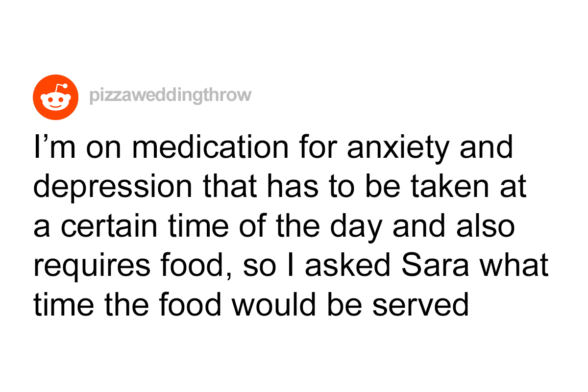 Recently, a 36-year-old groomsman shared an incident that happened at his long time friend Sara’s wedding. “I’m on medication for anxiety and depression that has to be taken at a certain time of the day and also requires food, so I asked Sara what time the food would be served,” the author, who goes by the handle u/pizzaweddingthrow, shared some background information in the post on the AITA subreddit.