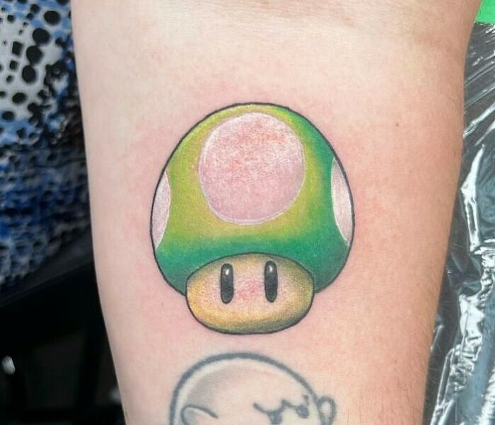 "What’s better than an extra life, check out this 1-Up Mario mushroom tattoo done by Cam."