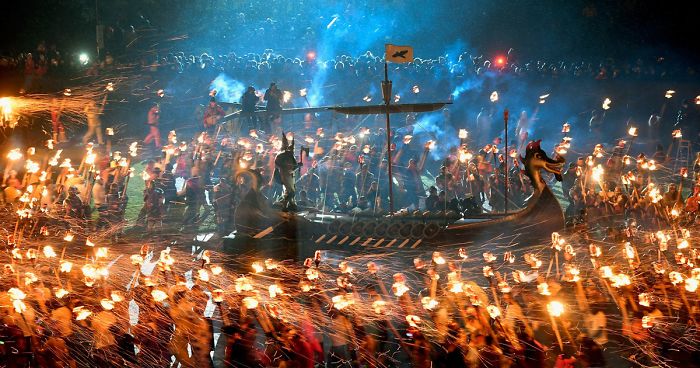 All groups of ‘vikings’ are known as Jarl Squads, which are led by an elected Guizer Jarl. The squads spend the whole day marching through Lerwick, the capital of Shetland province, and eventually make their way to the waterfront, where they burn a viking ship with 1 thousand torches. Once the boat is nice and crispy, they retire to town hall and drink beer until the sun comes up.