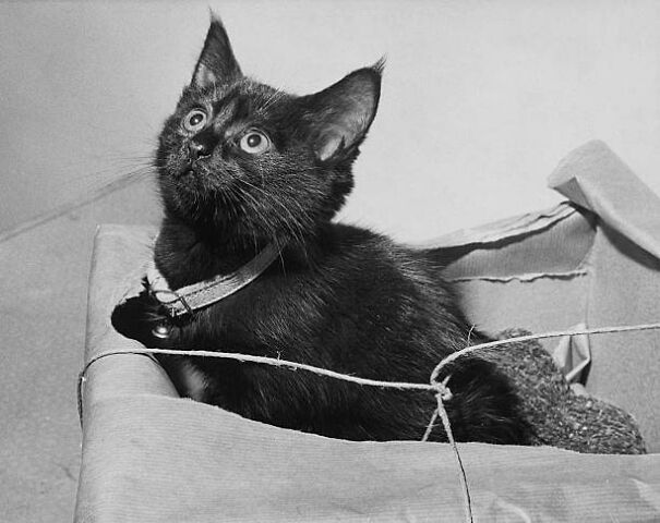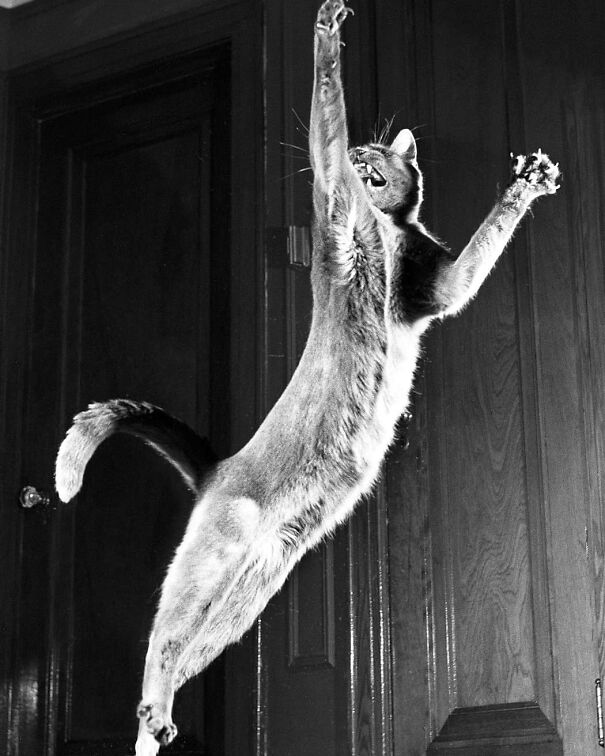 "A real leap of the cat immortalized by the lens of its human, Walter Chandoha, in 1951. The pussy, known as Loco, was rescued by the photographer from the freezing streets of New York and became his first feline model."
