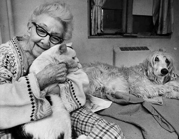 "Alice Stacy, a 91-year-old woman, hugs her cat named Mischief while Good Boy, her dog, sits next to her at the Columbia Point housing project in Boston's Dorchester neighborhood. The United States. 1988."
