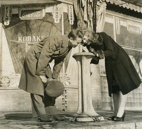 A Couple Drinking Water From Fountain. Michigan, 1940s