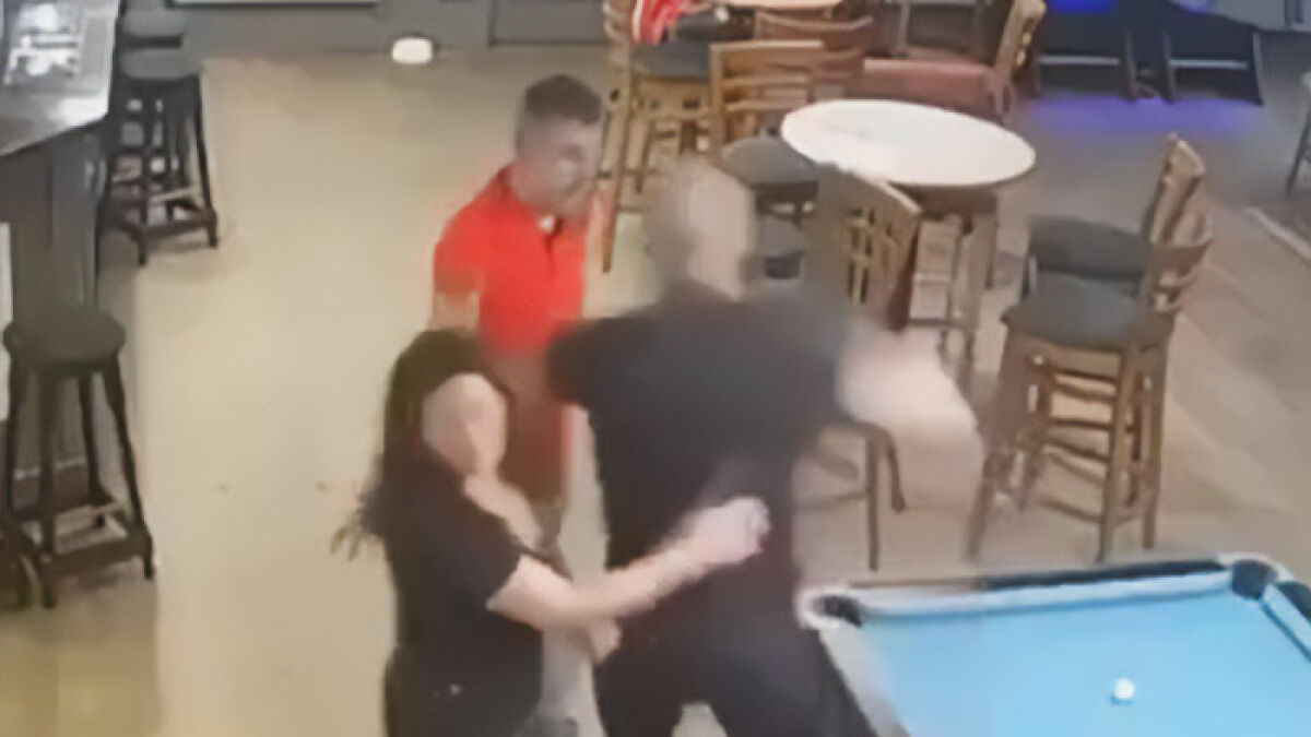 Moments later, another patron, who was previously seen throwing darts by the pool table, stepped in and stopped the husband from landing any more blows.