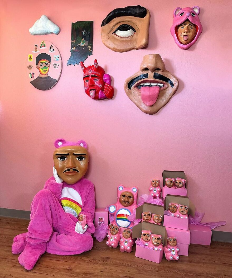San Francisco-based artist Joel Hernandez admits that he also was hiding under several masks when growing up, due to being gay and both Mexican and American. Making masks for Joel feels as if he is unburdening himself and taking them off of his own body.
