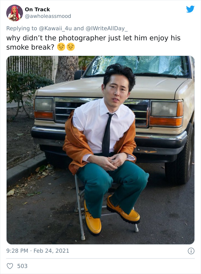 Load More Replies...I guess the director or photographer or whoever is like "you're a nice young man, we wanna take some pics of u, but we're gonna go in this depressing part of a city -- no, no, wait! there's a red car it's ok! but anyway we want u to squat and look like ur depressed and thinking of the world's problems while vaping, ok?"