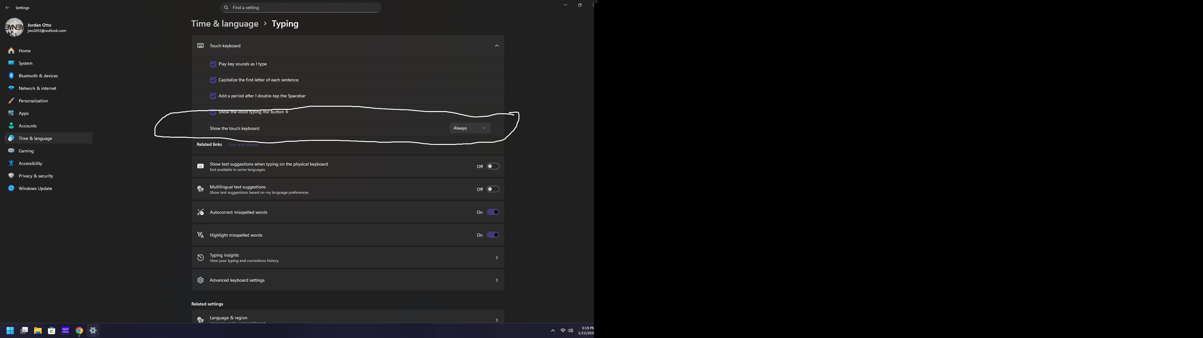 Windows 11 Open Settings: Use your mouse to click the Start button and then select the Settings (gear) icon. Navigate to Typing: Select Time & language from the left sidebar, then click on Typing. Adjust Touch Keyboard Settings: Click the arrow next to Touch keyboard to expand the section. Find the dropdown menu for Show the touch keyboard and select Always. This ensures it pops up even if the system doesn't detect you are in "tablet mode". Taskbar Icon: To ensure you can always manualy open it, go to Settings > Personalization > Taskbar and set the Touch keyboard toggle to Always.