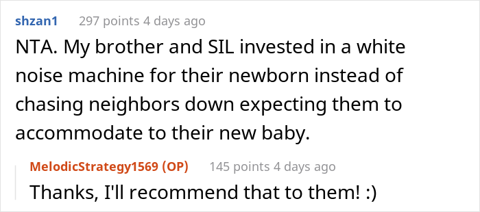 Load More Replies...Definitely NTA. It seems the neighbour might have become irrational due to lack of sleep. I know I'm much more patient and sane when I get a good night's sleep, than when I haven't slept well. It's one of the top reasons why I never wanted kids. If I didn't get any sleep for a long period of time, I might be driven to murder.