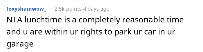 The buildup leading to this also included one time the neighbor parked their car a tad bit too close to OP’s house, meaning that they couldn’t park their car in their garage, meaning that they wouldn’t be opening the garage door, meaning they wouldn’t be waking the kid up. The car got towed. And this was also after they had talked about how parking outside is not an option for OP because of recent car thefts.