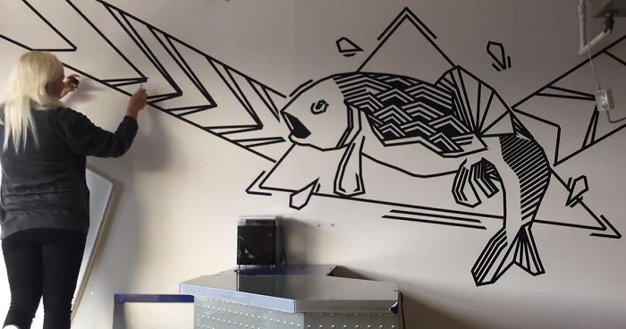 I discovered paper based tape for myself while living in yet another rental apartment in Berlin. The huge white walls in my room were beautiful but oh so empty and bland. So I picked up the tape rolls and I made my first tape mural right there in my bedroom. I loved the texture of the tape and how straight were the lines. My flatmate was laying on the bed just watching the process. He described it as calmingly mesmerizing. It was all great – the process, the outcome, the feeling. Since then I have been taping walls in multiple countries, homes with and for different people. When I first started I didn’t think much of what it all means and where am I going with this but today I know that it was the beginning of something magical (more info: Facebook).