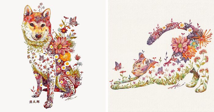 An artist from Japan, Hiroki Takeda, is known for his colorful watercolor paintings often depicting various cute animals composed from floral motifs. His way of painting is very unique and easily recognizable, so enjoy the beautiful fusion of flora and fauna that is depicted in his art.