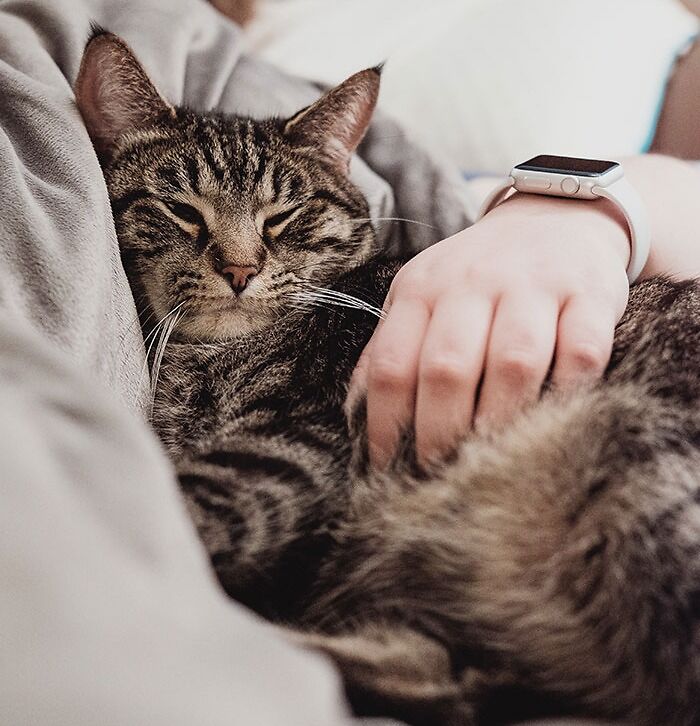 Cats purr in various situations, sometimes when they are upset or hurt too, but if it happens when they are all cozy and snuggled up to you, it is a sure sign they are comfortable around you and are feeling affectionate.