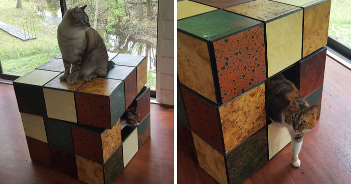 This Rubik’s Cube cat bed is the result of meshing the fun aspects of a Rubik’s cube with high-end furniture.