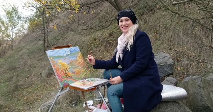 My colleague Marina Kondurova is a more experienced artist. In addition, she prefers to work in plein air more than in the studio. She is inspired by landscape, light, multiplanarity, sky, nature. She managed to create a beautiful landscape on canvas in the Impressionist style.