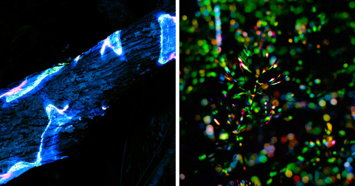 These organic forms were filmed in real-time, with glowing visuals made possible with a projector, light form and an outdoor generator.
