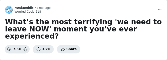 Someone recently asked “What’s the most terrifying 'we need to leave NOW' moment you’ve ever experienced?” and people didn’t hold back. They shared some truly terrifying tales of the times they trusted their gut, and got out real fast. To be honest, many of them are lucky to be alive today. Bored Panda has put together a list of the most incredible answers. From narrowly escaping mass attacks, to stepping out of a bank seconds before a robbery, a few of these stories might have you on the edge of your seat. Hopefully, they’ll encourage you to trust your own instincts and listen, next time your inner alarm starts blaring.