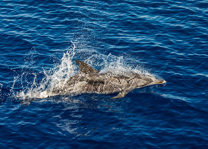 At the beach with my little brother and dad. We wandered into the ocean, maybe a little further than we really meant to. As we are hanging out in the water, suddenly a fish jumps out of the water right near us. We chuckle at what we thought was a funny moment. Then another fish jumps out of the water even closer to us. Then a third. As my dad and I looked at the water a very large shadow swam between my dad and me/my brother. A fin broke the water surface around us and another fish jumped between us. Dad and I locked eyes, and without saying a word, I understood I was to grab my brother as we tried to get back to the beach with dad following us. Right as we were about to move, it turned out to be a dolphin. Never been so scared and relieved within a few moments.