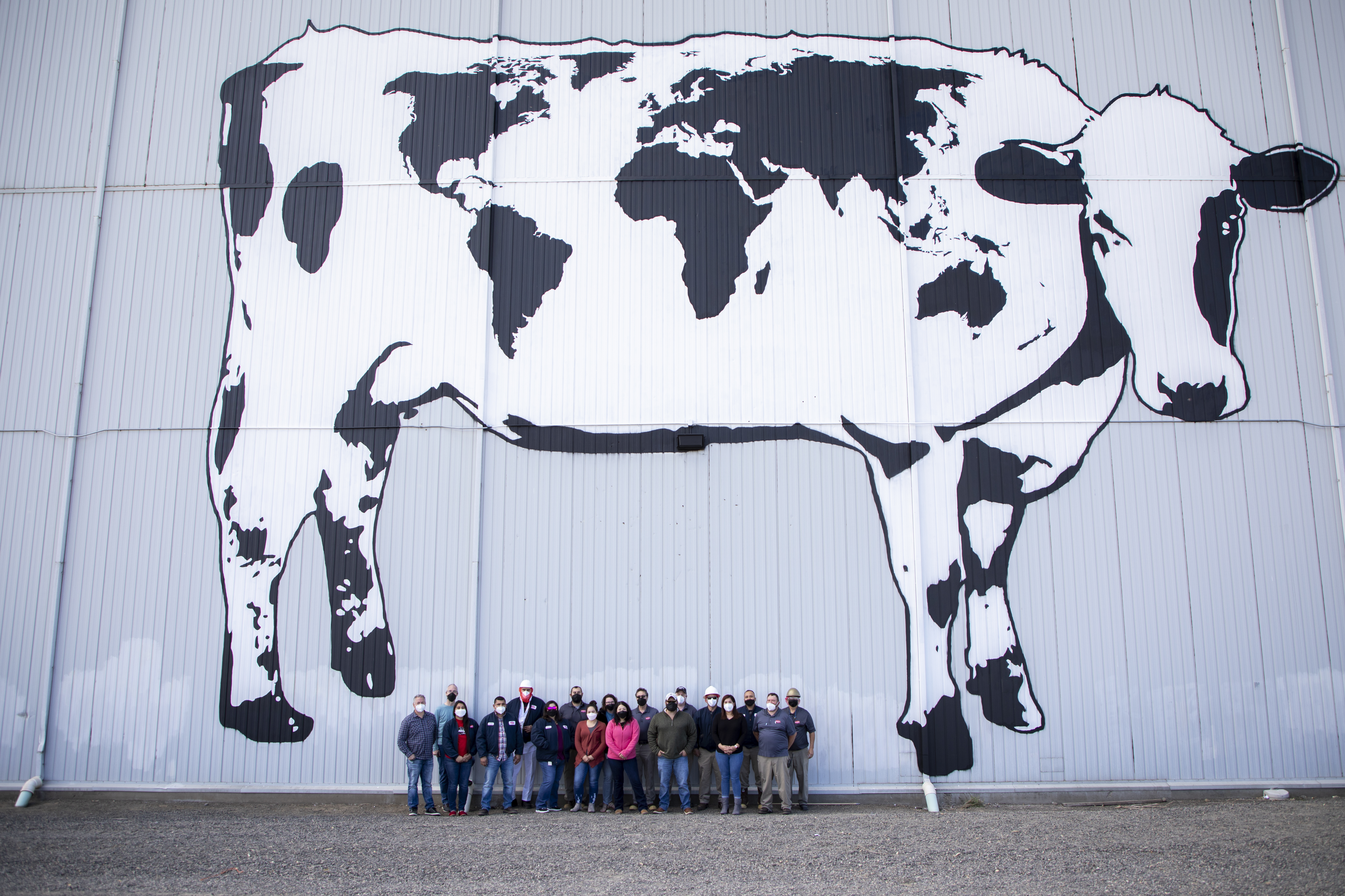 We recently painted a giant World Cow mural for Darigold — a farmer-owned dairy cooperative in the Northwest U.S. —at their Sunnyside processing facility. The 44-by-66-foot mural of a Holstein cow with spots arranged as a world map is the largest cow we have ever painted.