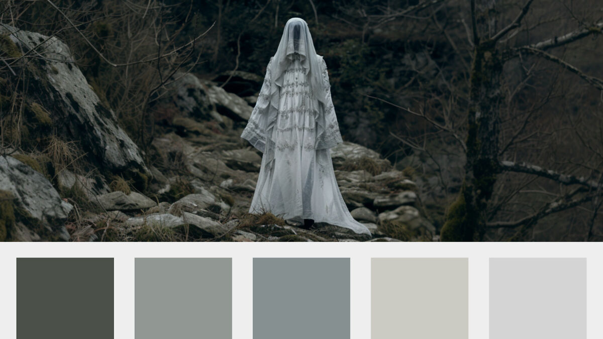 The Ghost palette revolves around spectral whites, silvers and smoky grays, conjuring the quiet hush of a moonlit apparition. This soft, monochromatic scheme feels otherworldly yet serene, like stepping into a tranquil mist. The image of a lone ghost floating in a twilight forest paints a scene that is hauntingly calm and mysterious, with pale shades that feel surprisingly peaceful.