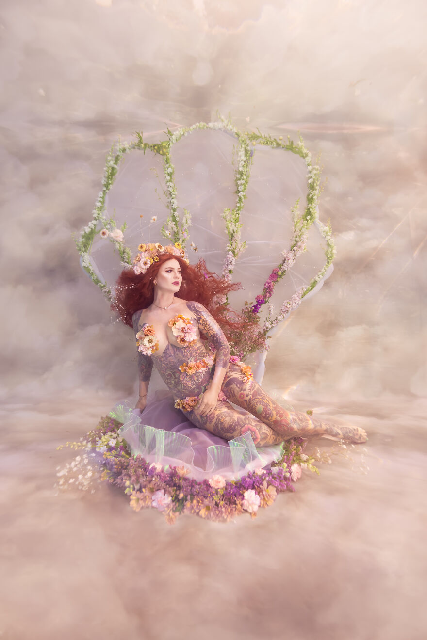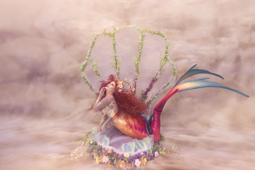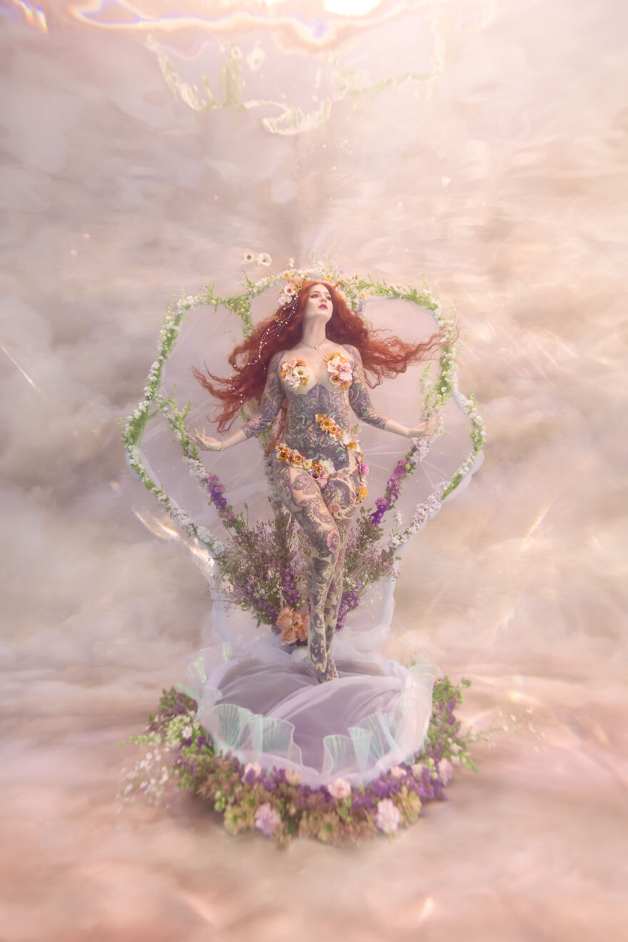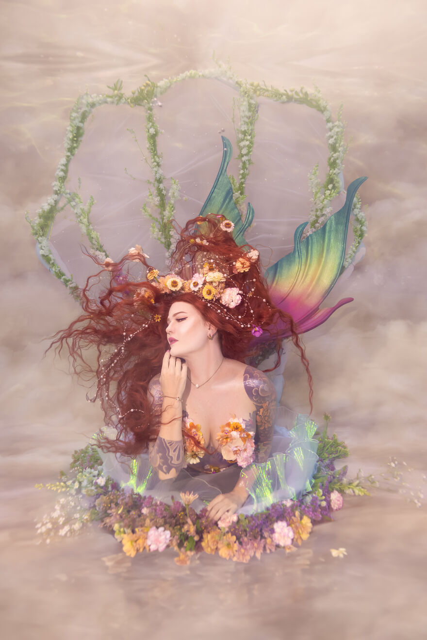 Small business owner (Crescent Creepers), Haley Smith, has long been inspired by the idea of bringing this scene to life and was the inspiration behind these other-worldly images. When Haley, a professional model and mermaid, and her husband Mike created the metal frame for the large shell, Haley enlisted photographer and florist friends to bring the scene to life—underwater, no less.