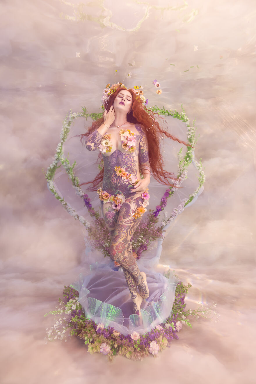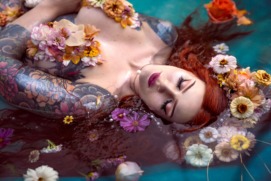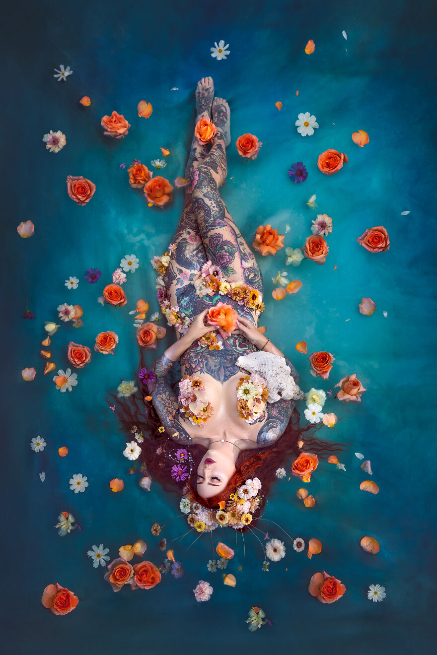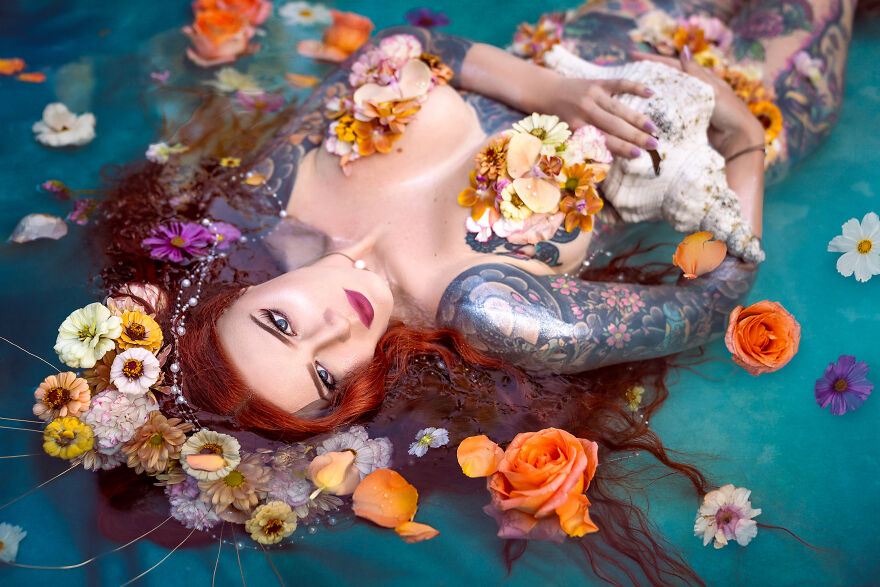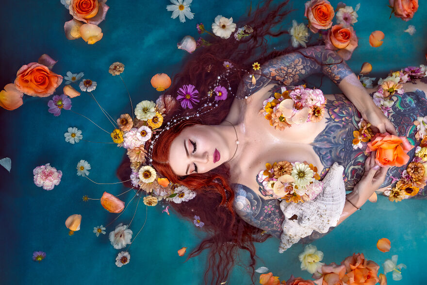 Small business owner (Crescent Creepers), Haley Smith, has long been inspired by the idea of bringing this scene to life and was the inspiration behind these other-worldly images. When Haley, a professional model and mermaid, and her husband Mike created the metal frame for the large shell, Haley enlisted photographer and florist friends to bring the scene to life—underwater, no less.