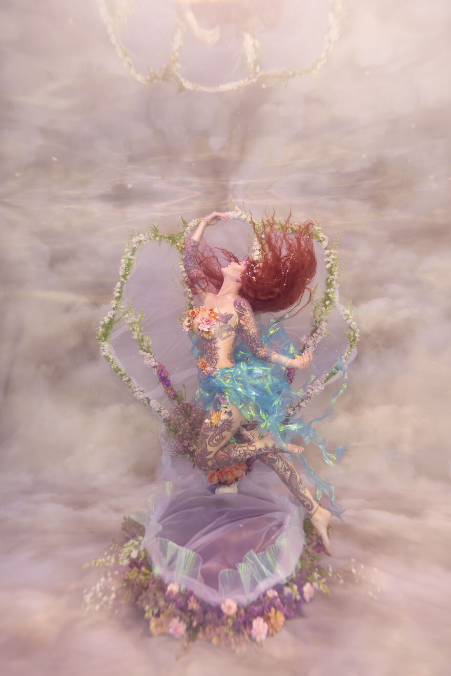 Kimber Greenwood, owner of Water Bear Photography, is an internationally acclaimed underwater portrait photographer. Kimber and her team are the creative force behind the other-worldly images, including a backdrop for the set that features an ethereal cloud design by Baby Dream Backdrops.