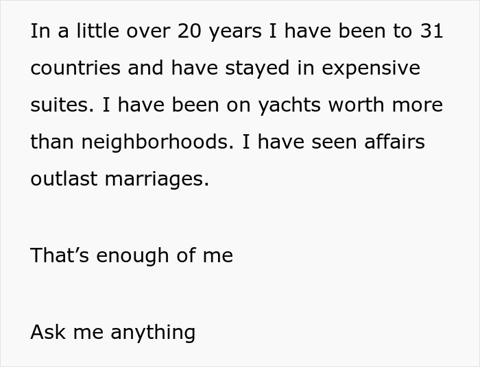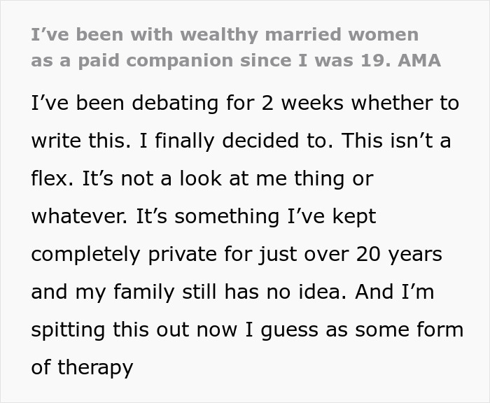 In a viral thread on the AMA subreddit, internet user u/xKillRoy bared all about his work as a paid companion for wealthy married women. Scroll down for his honest answers to people’s questions about his line of work and the world he suddenly found himself thrust into. Bored Panda has reached out to the author for comment, and we’ll update the article as soon as we hear back from him.