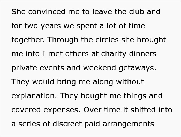 He found himself meeting new clients at charity dinners, private events, and weekend getaways. “They bought me things and covered expenses. Over time, it shifted into a series of discreet paid arrangements,” he wrote online.