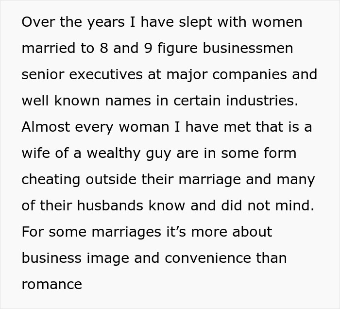 “Almost every woman I have met who is a wife of a wealthy guy is in some form cheating outside their marriage, and many of their husbands know and did not mind. For some marriages, it’s more about business image and convenience than romance,” u/xKillRoy said, sharing his perspective.