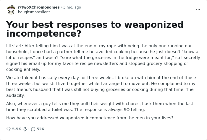 Someone shared how their husband refused to cook because he didn't "know a lot of recipes." Instead of taking it upon herself to do all the cooking, his wife not only decided to sign him up for all her favorite recipe newsletters, but she also stopped grocery shopping and cooking altogether. She's asked others to share their "best responses to weaponized incompetence."