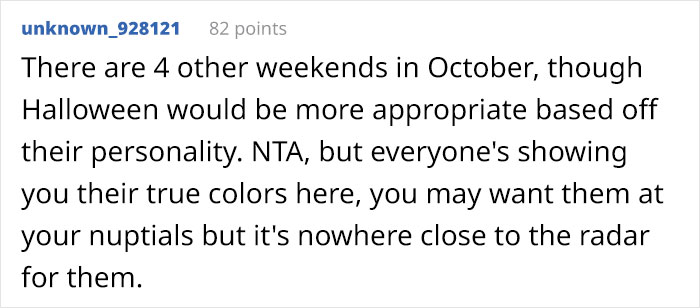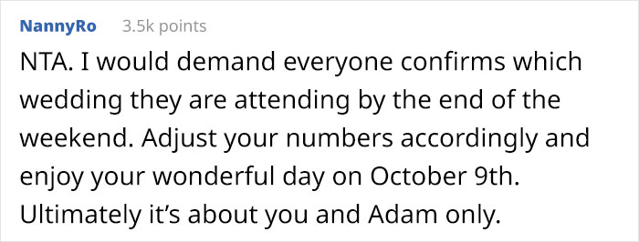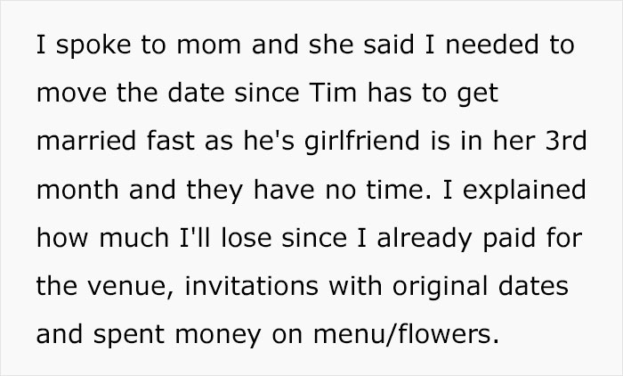 Load More Replies...This is horrible. First, the brother is a sh!t, then the parents take his side and expect the daughter to change the date? What a rotten family. That poor girl. I hope she gets married anyway and cuts out her family even if it's really hard to cut them out. Aaaw this story made me mad and sad at the same time.