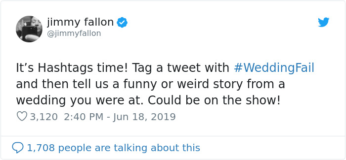 When there are open bars, extended families, future-in-laws who don't get along or any other fantastic mix of variables, there is sure to be some excitement or, rather, epic fails. In honor of this season, Jimmy Fallon asked his followers to tweet out a funny or weird story of a funny wedding mishap they experienced attending with the hashtag #WeddingFail, for the chance it could be read on The Tonight Show Starring Jimmy Fallon show - and boy did they deliver. Scroll down to check out the best tweets, and don't forget to upvote your favs!