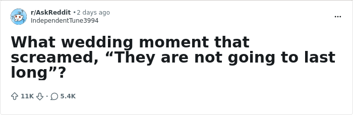 Yet, many of the marriages on this list were much, much shorter. Wedding guests, photographers, musicians, and other attendees flocked to a recent thread online in response to a question, "What [was a] wedding moment that screamed, 'They are not going to last long?'" They shared the wedding red flags that showed they knew a couple wouldn't have their happily ever after.
