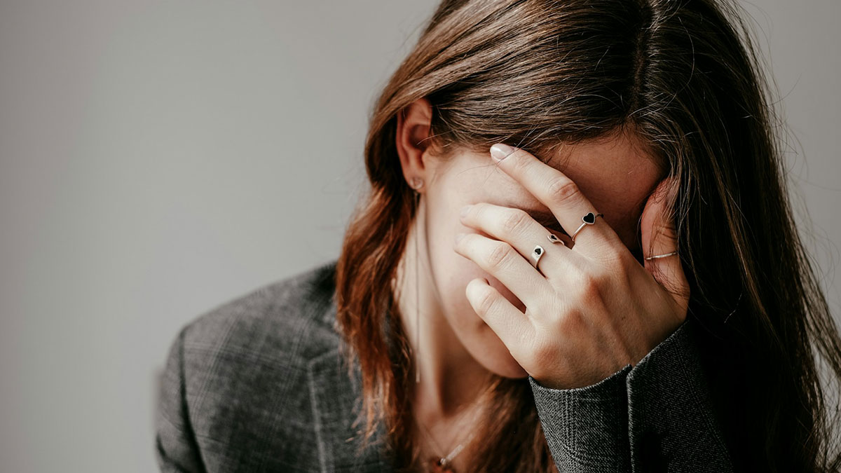Woman covering her face with her hand, expressing stress and doubt, relating to wedding signs they’re not going to last long. They had a “who knows their partner better?” game.