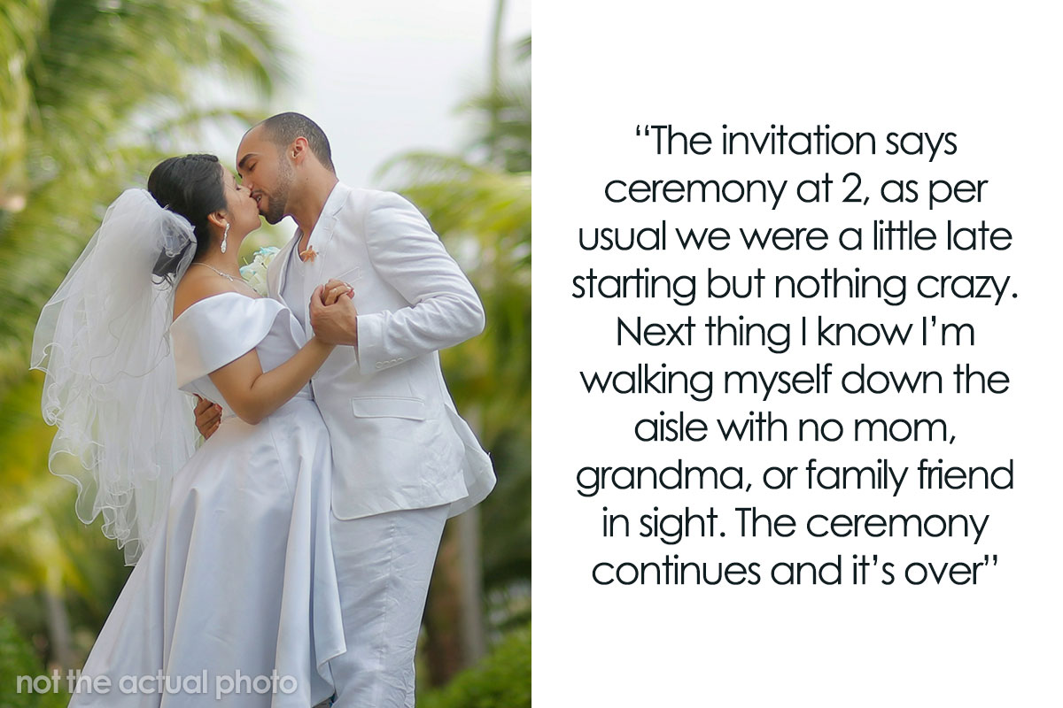 The poor bride had no choice but to walk herself down the aisle. When her family finally showed up, her mom was quite hostile. The mother made many excuses and even tried to blame the OP. The poster later found out that because her mom didn’t get ready fast enough, everyone got held up.