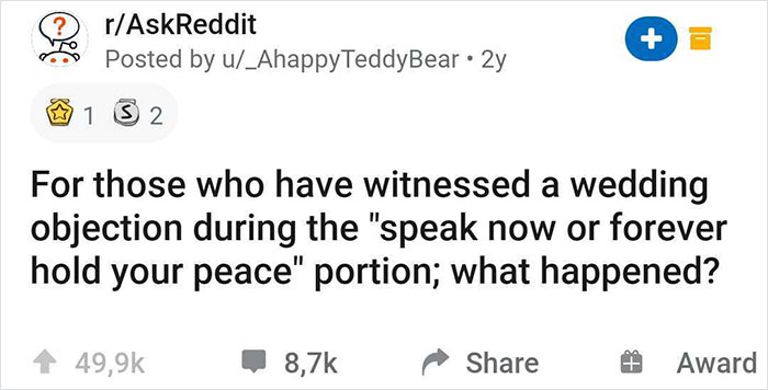Redditor AhappyTeddyBear’s thread got nearly 50k upvotes and got 8.8k comments. People were lining up to share their own unforgettable and dramatic wedding experiences.