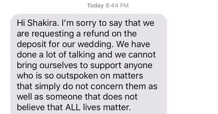 In fact, the bride got so upset she requested a refund for her deposit. The bride called Shakira “not stable enough to complete the job” and said that the couple “would be embarrassed to have her” photograph their wedding, as they were looking for someone who believes “all lives matter.”