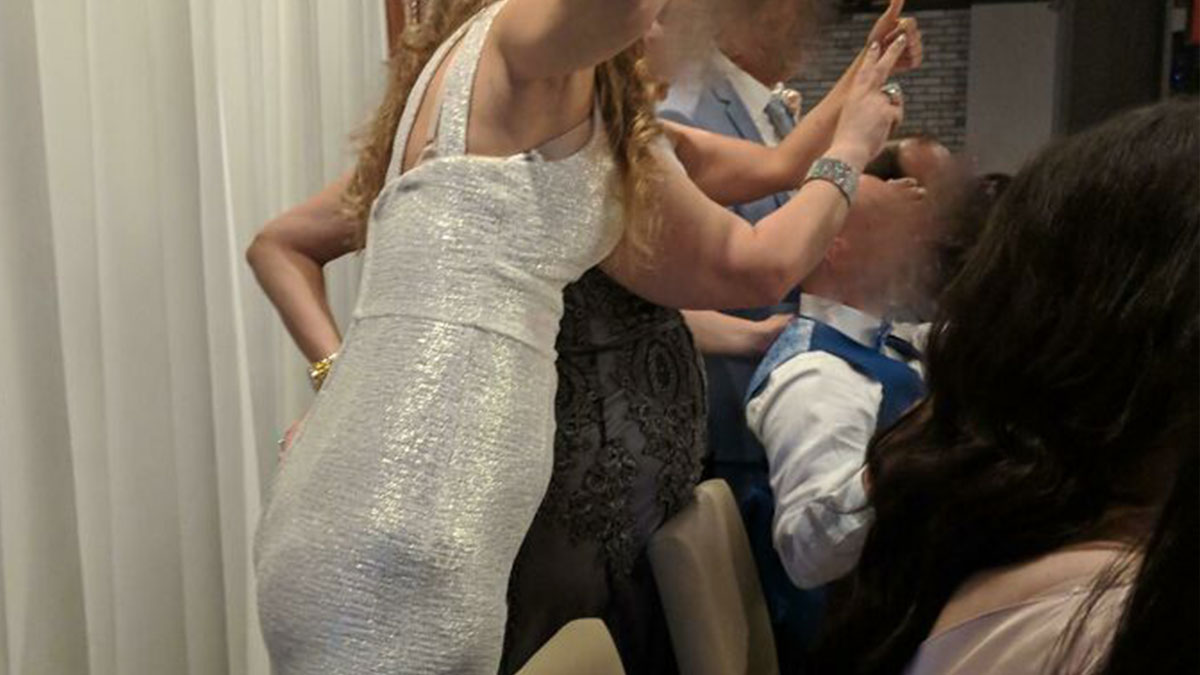 Flashback To When My Mother In Law Wore This To Our Wedding. You Could Also See Her Purple Thong Underwear Through The Material. See Her Hand Reaching Out! This Was During The Kiss When She Grabbed Him So She Could Kiss Him